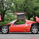 ボディ形式はFRPモノコック製クローズドクーペだが、ユニークなのはサイドウィンドウ部だけガルウイング形式で跳ね上がるドアのレイアウトだ。