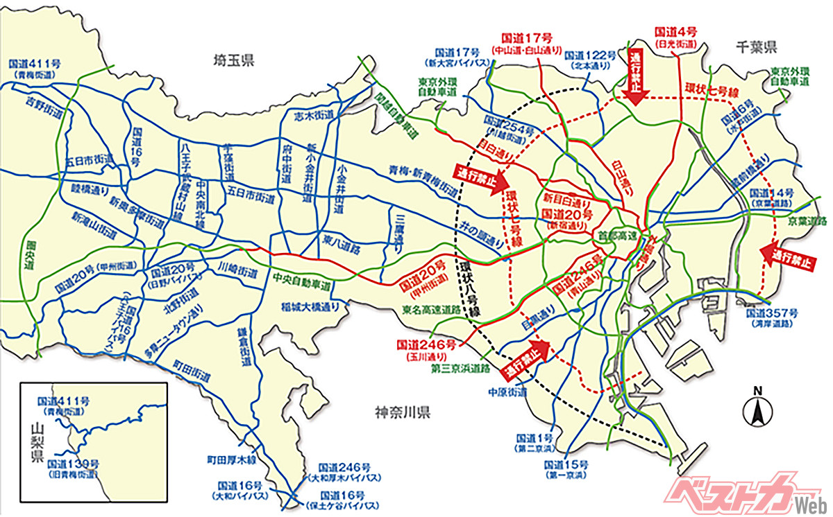 東京都では大地震発生時、人命救助、消火活動等に従事する緊急自動車等を円滑に通すための交通規制がかかる。ここに示された幹線道路は緊急車両専用となり、環状七号線内側方向へ流入する車両の通行は禁止となる(警視庁資料より)