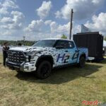 サウナハウスは3トンほどあるが、タンドラのFCEVモデルでけん引してきた。牽引しての航続距離は約300㎞だという
