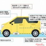 エンジンのないバッテリーEVの場合も、高電圧バッテリーや電動モーターは基本的に防水設計されていますが、補機用の12Vバッテリーはガソリン車と同じく水に弱い特徴があるなど、過信は禁物です。冠水路に進入することはまた、水没によって乗員が閉じ込められてしまう原因にもなります。