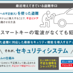 スマートキーの微弱電波を中継して、家屋内にあるキーをクルマの近くにあると誤認させ、遠隔でドア解錠、始動させる手口。複数人による電波中継が特徴です。