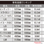 全長×全幅により専有面積を計算。さらに1畳=1.62平方メートルから畳換算してみると、6.4畳で3車が並ぶも平米数が僅差で勝るセンチュリーが1位。
