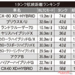 燃費で稼ぐか、タンク容量で稼ぐかの一戦。燃費が19.2km/L、タンクが74Lと高バランスのCX-80のディーゼルが1位。異色なのは異次元の120Lタンクのランクル70で堂々の3位表彰台!!