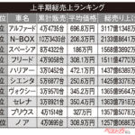 3000億円突破のアルファードが堂々1位。バカ高いのに大衆車並みに売れているから当然。驚異の販売台数のN-BОX、スペーシアが2位、3位。
