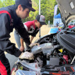 そうそう。サービスはダイハツのメカニック育成チームに加え、日産自動車大学校の学生さん2人が担当した。ダイハツのテントに日産自動車大学校の桃太郎旗。