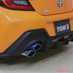 そしてGR86用「トムス・バレル」といえば、斜め4本出し。今回のアップデートでもそのレーシーなスタイルは健在で、バンパー下から覗くテールエンドは存在感抜群だ。