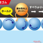 しかし、新配合された親水性向上ポリマーが水膜に触れることで、水は粒状にはならず、薄く広がることでタイヤとの隙間で抵抗となり、ジワリと粘るようにグリップ力を高める効果を生むのだという。