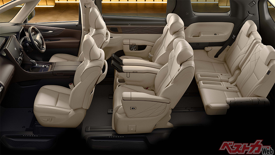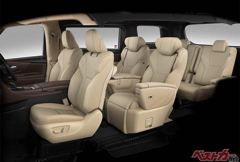 トヨタ アルファード Executive Lounge(内装色:ニュートラルベージュ)シート表皮:プレミアムナッパ本革(2022年1月 発売開始時の公式画像より)