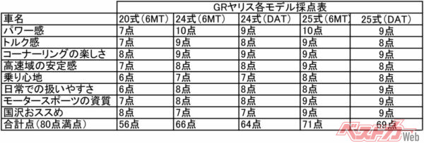 そこまで敏感じゃない20式なら、10ラップしたって大きな差が出ない。350万円くらいで走行2~3万kmの売り物に出会えば面白いと思う。 コスパも含めた私のおススメは25式が1番、2番に20式、3番が24式となる。以下採点だ。