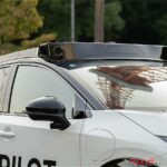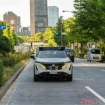 試乗車はルーフにセンサー類を載っけたアリア。全身に11個のカメラと5個のレーダーセンサー、1個のLiDARが搭載されているという。LiDARは薄い弁当箱くらいのサイズだがルミナー製というから、ボルボのEX90(日本未発売)が搭載する「Iris」と同じかもしれない。