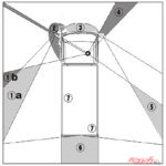 図中(1)b:左後方広角/すべてのミラーを使っても見えないのが、左側広角のナナメ後ろだ。合流や本線料金所などで左大そとから追い越しをかけてくるクルマはまったく見えない。