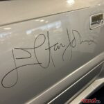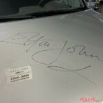 直筆サインはふたつで、ボンネットとドアに大きく入っています。また、エルトン・ジョンにちなみ、ピアノを模したデザインの装飾がボンネットとBピラーに施されており、なかなかお目にかかれない一台となっています。