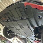 ノアの場合はフロントに6枚、フロアセンターに7枚、リアに5枚の、合わせて18枚を貼付する。貼り付けるのはフロントアンダーカーバーの下やフロア部分、ガソリンタンクの下やリアバンパー部分など様々。基本は左右対称に貼付されるが、そうならないところもあるのが面白い。中には士別フィンを切って貼付する場所もあり、整備士の方は取付説明書とにらめっこしていた。