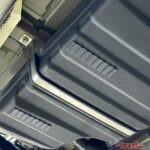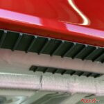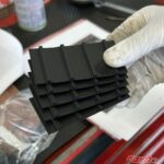士別フィンは縦40mm・横80mm・高さ3mmの小さな部品だ。高質なプラスチックゴムのような材質で、フィンと反対の面には両面テープが付いている。これを車種別に研究された取付位置へ、正確に貼っていくことで大きな効果を生み出すのだ。ちなみに取付位置は、駆動方式(2WD・4WD)やガソリン・HEVによって異なるのも興味深い。