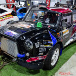 巨大な前置きインタークーラーやボンネットまで伸びたマフラー、強烈なワイドボディに巨大ウイングなど奇抜さが目立つオースチンミニのラリーカスタム。実は超本気のラリー仕様でレース入賞も果たしている実力派。もともとターマック仕様だったが、グラベル仕様に変更した模様。