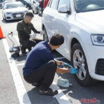 このサービス、「ミシュラン製に限る」なんてケチなこと言わないのがミソ。点検作業も実に気合が入っており、複数のスタッフがクルマに飛びつき、指定空気圧の確認から空気圧計測&補充、溝の残量チェックまで行う様は、レーシングカーのピット作業のようだった。