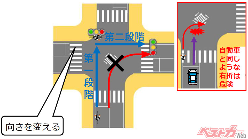 二段階右折とは、あらかじめできる限り道路の左側に寄り、交差点の側端に沿って徐行する。そしていったん交差点を渡った後に、一番左車線で待機して、信号が変わってから直進して右折を完了させる形だ。非常に面倒だが、これだけは法令で決められている。