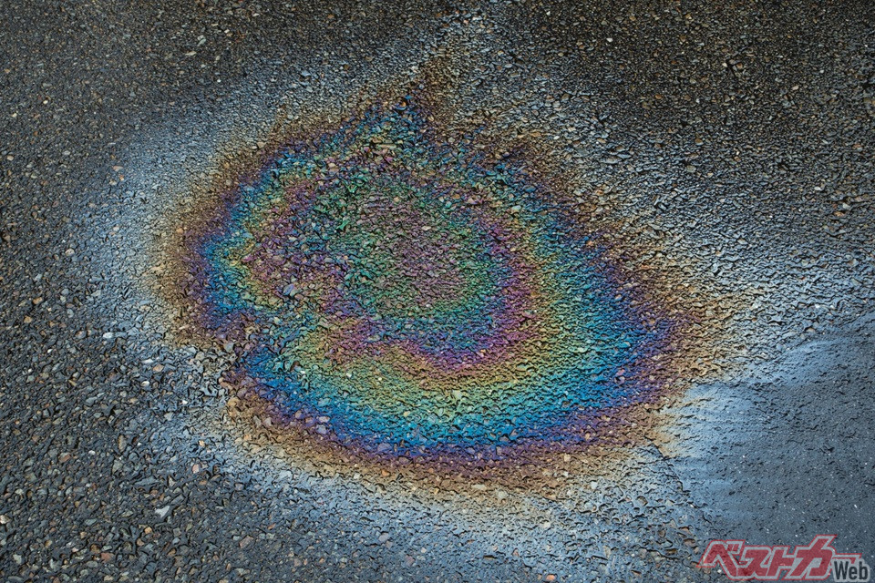 また濡れた路面では、匂いとともにガソリンや軽油が油膜となり、虹色のような模様(オイルの場合も同様)が広がるのでわかるはずだ。