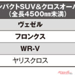 ヤリスクロスを破って3位の座を勝ち取ったWR-Vは大健闘だ。フロンクスもトータル性能が高く、買い得なSUVだが、輸入車のため選択肢が少ない。