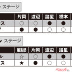 (1)ファーストステージで2位と3位が引き分けた場合(4人の勝敗判定が2対2になった場合)は2位のクルマがファイナルステージに進出となる。