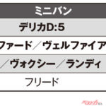ミニバンジャンルでデリカD:5が1位とは意外だったが、考え直してみるとミニバンでありながら悪路走破性も視野に入れたクルマなんてほかにないですもんね。