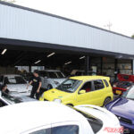 案内された場所に徒歩で向かうと自動車部のガレージが見えてきました。屋根付きの整備エリアの中には試合車のインテグラタイプRとスイフトスポーツ、それと1年生用の練習車、プレオが入っており、作業性はよさそう。