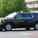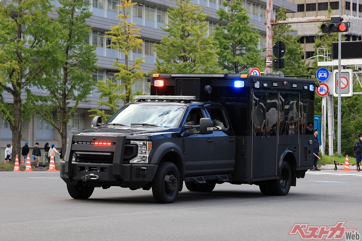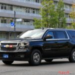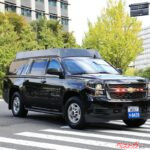 警視庁の後衛警護車のすぐ後には、米国の警護車ハーフバックと電波妨害を行うECMサバーバン。そして警視庁のフォード警護指揮車を挟んで、その後ろにはWHCAの「ロードランナー」サバーバンが追走。この車両は大統領の行先地での安全な通信環境を構築・確保するための車両で、今回の運用は異なっていたが、通常はWHCAの「フォードF350スーパーデューティー」とペアで活動している。