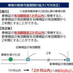 2025年4月1日に施行となった改正道路運送車両法施行規則によって、「自動車車検証の有効期間が満了する日の2か月前から当該期間が満了する日までの間に継続検査を行う」ことで、新車検証の有効期間の起算日が旧車検証の有効期間満了日の翌日となる、つまり車検証の残存有効期間を失うことなく、2か月前から車検を受検することが可能となった。