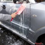 融雪剤や凍結防止剤はボディ下部だけでなく、ボディのあらゆる箇所に付着している。これを面倒だからとたっぷりの水で落とす(予洗い)ことなくいきなりスポンジ洗車をしてしまうと、塩分(や土埃)をボディ上で引きずることになり、塗装面を傷めてしまう。