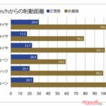 ちなみに、凍結した路面(氷盤路、アイスバーン)では、スタッドレスタイヤであってもタイヤチェーンを装着した場合には遠く及ばないことが、同テストで示されています。圧雪路ではタイヤチェーン(28.4m)よりも短かったスタッドレスタイヤの制動距離(17.3m)が、氷盤路ではスタッドレスタイヤが78.5m、タイヤチェーンが59.0mと、タイヤチェーンを装着した場合の約1.3倍も制動距離が長くなっています。なおノーマルタイヤはスタッドレスタイヤよりもさらに長い105.4mという結果です。