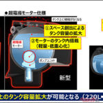 モーターを超伝導状態にすると、驚くほどの小サイズで大きな出力を出せる。その理論を使い、トヨタは液体水素燃料タンクの中に電動ポンプを組み込んだ。ポンプのサイズを圧倒的に小さくできるため、イラストのようにタンク容積を大きくすることが可能になる。