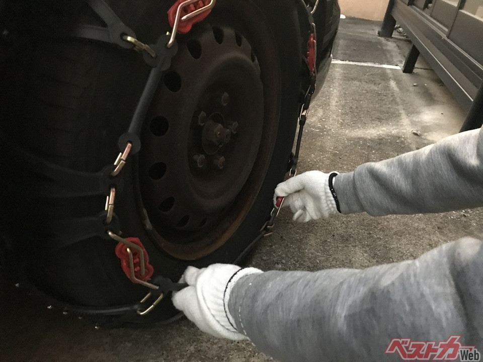 そして、タイヤチェーン購入後は一度商品を取り出し、装着の予習をしておくこともお薦めする。本当にタイヤチェーンが必要な時は、大抵が薄暗い中で寒さに手がかじかんだ状態で取り付けることになる。