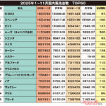 2025年1~11月の販売ランキングは、1位がN-BOX、2位はスペーシア、3位はタントだ。
