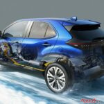 ヤリスクロスのE-Fourハイブリッド。荷室下にはリアモーターと排気系が密集する