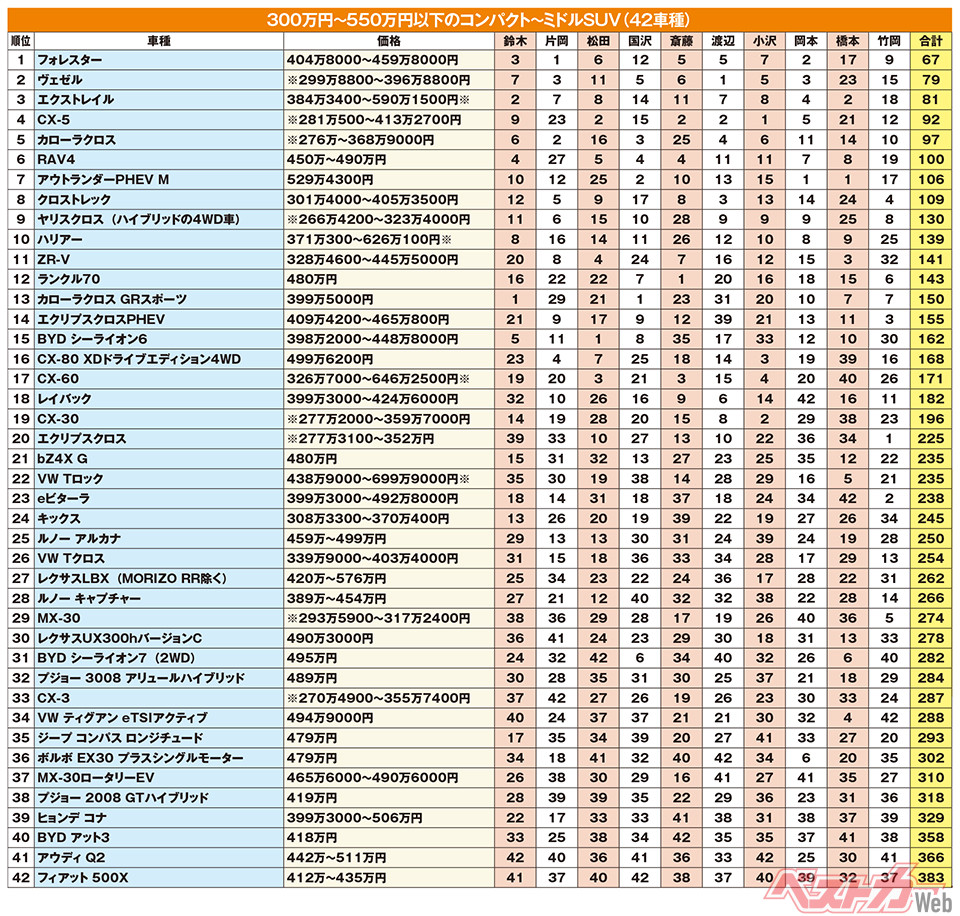 この価格帯のSUVは車種が多い激戦区である。輸入車も選べるが、コスパで見劣りするために下位に沈んだ。1位に輝いたフォレスターは、8人がひと桁の順位と、満遍なく点を稼いで順当にトップに立った。