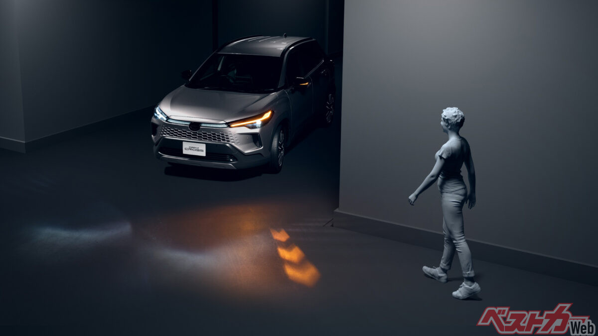 カローラクロス一部改良における最大の特徴は、小糸製作所開発によるウインカー連動で地面に矢印を映し出す「シグナルロードプロジェクション」を国内初採用したことだ。