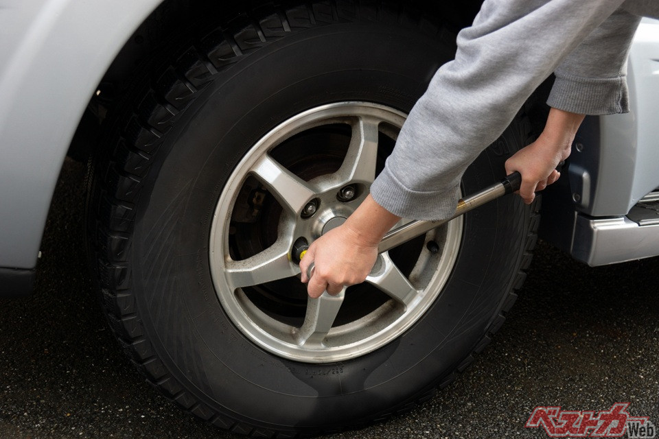 しかし、取り付け後にある程度走行すると、稀に緩んでしまうこともある。そこで「増し締め」。増し締めは、タイヤ交換後50〜100km走行後に行うが、これをトルクレンチで作業する。