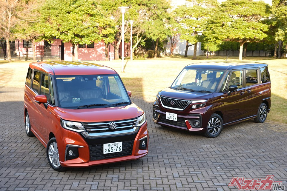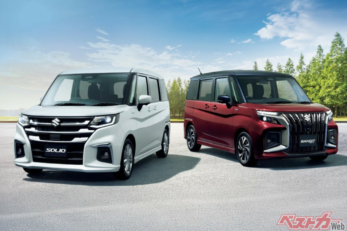 2025年の一部改良でフロントマスク変更前のソリオ(左)とソリオ バンディッド(右)。両モデルともアルミホイールやバッグドアサイドスポイラーなど