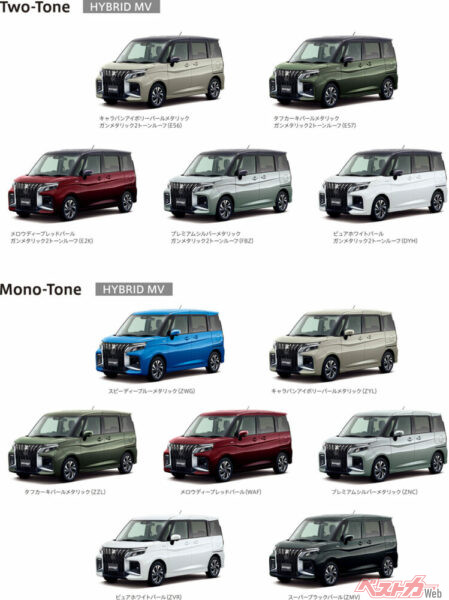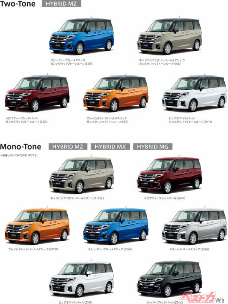 ソリオはHYBRID MZグレードは2パータン全12色。HYBRID MXおよびHYBRID MGは全7色。