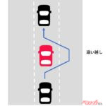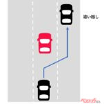 前文では、条文内の「進路を変えて」をわかりやすく「車線変更して」と書いたが、現実的にクルマが1車線内で2台並走できる道路はほぼ存在しないとしたうえでのことなので、もし「車線変更せずに進路も変えず(ハンドルを切らず)に前車の前に出た」なら追い越しではなく「追い抜き」。