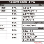 そこで3年後の残価率が高い車種を表にまとめた。全般的にSUVは残価率が高く、60%を超える車種も豊富だ。