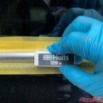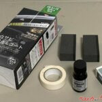 今回テストした商品はホルツの白サビ除去&コート「ドアモールシャイン」(価格:1980円)。セット内容はコート剤、コーティングスポンジ×2、マスキングテープ、そして320番/600番/1200番/3500番のサンドペーパーがブロック4面に貼り付けられている。