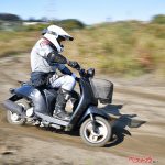 そして走り出してしまえば、そりゃもうスリル満点の世界が待っている。コーナー内側に足を突き出して曲がるのはモトクロスと同じだが、なんせバイクの基本であるはずの「ニーグリップ(タンクを両膝で挟んで体を安定させること)」ができない。