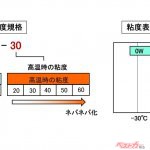 一般的なオイルは、気温-20℃程度まで始動可能です。オイルは、クルマの種類や用途などに対応した様々なグレードが用意され、その指標としてSAE(米国自動車技術者協会)が規定した「〇W-●」が使われます。「〇」は低温時の粘度指数を示し、数字が小さいほど粘度が低いサラサラのオイル。一方の「●」は高温時の粘度指数で、数字が大きいほどネバネバのオイルで、高温時の油膜保持性を表しています。