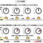 次に、タイヤの回転数がTVカメラの撮影周期よりも長くなる(回転が下がる)と、撮影時のタイヤ位置は毎回少しずつ遅れるので、撮影動画はゆっくり逆回転しているように見えます。反対にタイヤの回転数が上がると、撮影時のタイヤ位置は毎回少しずつ早まるので、ゆっくり正方向に回転しているように見えるのです。