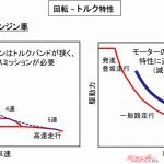一方のモーターは、トルクバンドが広く、停止状態から一定の速度までは最大トルクを維持し、その速度を超えるとトルクは徐々に低下します。この特性は、クルマに求められるトルク特性と近いので、モーターはトランスミッションがなくても、様々な運転条件に対応できるのです。