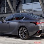 上の写真は現行のIS350だが、ドアパネルより上の部分からリアラゲッジに伸びる部分、サイドパネルの立体感やテールライト周りの雰囲気もよく似ている。エレクトリファイドセダンはまさにISが正統進化した電動スポーツセダンであることがよくわかる。
