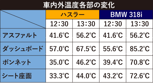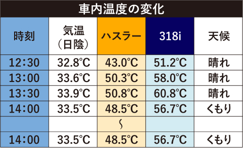 残念ながら1時間半を経過したところから雲が多くなり、日差しが遮られたことでクルマの温度が低下してしまったが、それでも室内温度はハスラーが44℃、 318iが52℃と、長時間車内にいることは厳しい温度のままだった。