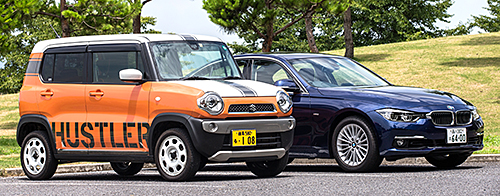 つづいて、編集部林が行った、群馬県館林市での実験の様子を紹介しよう。テスト車両は、白いカッティングシートがボンネットに貼ってあるオレンジのハスラーと、黒いボディのBMW 318iだ。