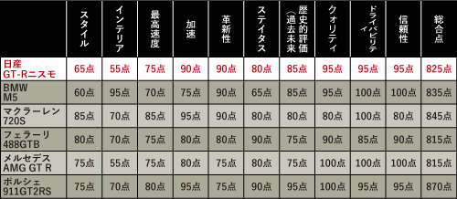 対GT-Rニスモでは、加速やドライバビリティなど、革新性以外の9項目で、引き分けもしくは勝ちとなり、圧勝した。総合点870点は12気筒スーパーカー軍団に優るとも劣らない。